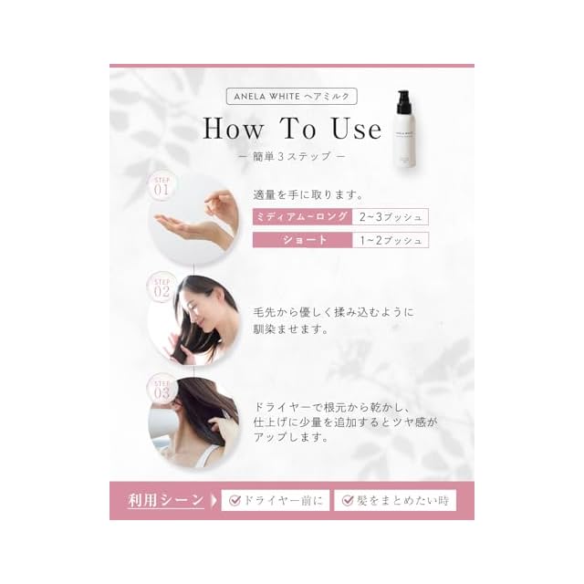 ✨【こだわりの低刺激処方】髪と頭皮にやさしく、安全性に優れた厳選成分を使用【ご使用方法】①適量を手に取り、毛先からやさしく揉み込むようになじませます②ドライヤーで根元から乾かし、仕上げに少量を追加するとツヤ感がアップします