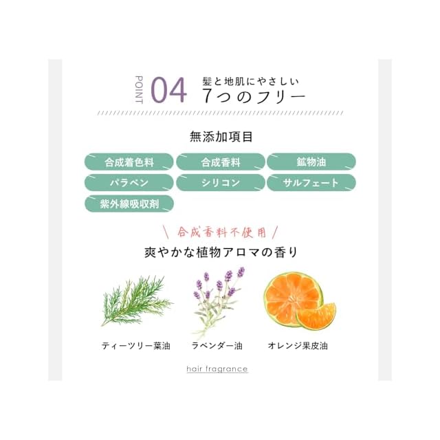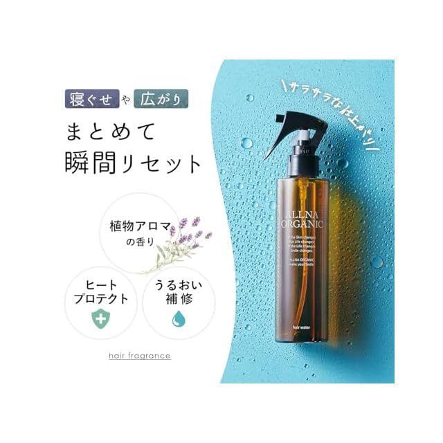 【 瞬間、まとめる 】潤い成分のたっぷり入った ヘアウォーター を髪にひと吹きするだけで、毛を柔らかくし、スタイリングしやすい髪にします。 【 髪と頭皮に嬉しい 無添加 】 オーガニック で刺激の少ない無添加だから、優しい使い心地。 敏感肌 の方にも。 【 高品質の潤い成分配合 】 保湿成分で髪を潤し、コーティングすることでダメージから髪を守ります。 【 爽やかな香り 】植物アロマでボタニカルな香りに仕上げました。ティーツリー葉油×ラベンダー油×オレンジ果皮油を基調としています。 【 使用方法 】ドライヤー・ヘアアイロンの前に髪にしっかり馴染ませ、ドライヤーで乾かしブラッシングしていきます。その後ヘアアイロンなどを使い、セットしてください。