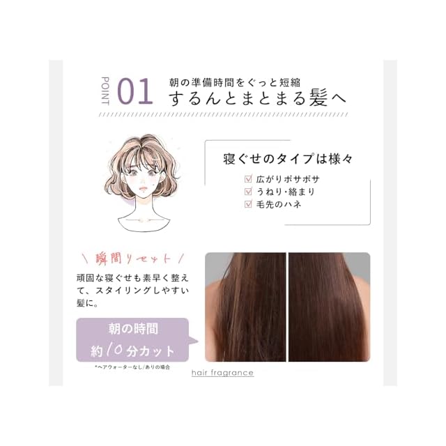 【 瞬間、まとめる 】潤い成分のたっぷり入った ヘアウォーター を髪にひと吹きするだけで、毛を柔らかくし、スタイリングしやすい髪にします。