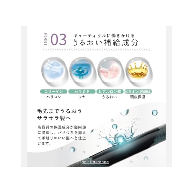 【 高品質の潤い成分配合 】 保湿成分で髪を潤し、コーティングすることでダメージから髪を守ります。