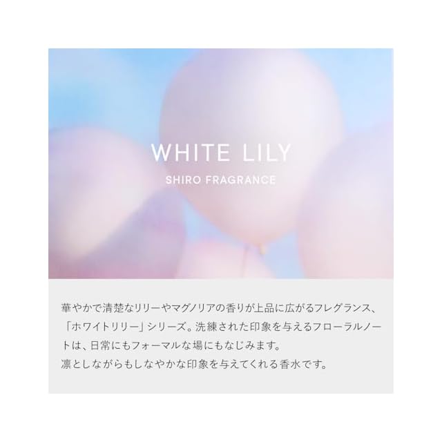 【こころゆくまで楽しめるオードパルファン】<br>華やかに広がる香りをこころゆくまで楽しめるオードパルファン。時間とともにうつろう香りを、心ゆくまでお楽しみいただけます。<br>【優しく包み込む自然な香り】<br>新しいホワイトリリーは、ミドルノートのリリーを強め、マグノリアなどフローラルの香りを加えることで、全体的に丸みのある印象へと整えました。従来の香りの特長を引き立てつつ、優しく包み込む自然な香りになっています。ホワイトリリーは、そっと隣で、なりたい自分へと近づけてくれるフレグランスです。香調だけでなく、製品ごとの香り立ちやテクスチャーも、よりお楽しみいただけるよう改良いたしました。<br>【生まれ変わったサボンとホワイトリリーでもっとわたしらしく】<br>長年、多くのお客様にご愛用いただいている「サボン」「ホワイトリリー」の香り。 2022年9月、一部香料*を変更し、よりお楽しみいただける香りへとリニューアル。<br>*対象の香料「リリアール」に、アレルゲンとなる可能性が報告され、使用制限が変更となりました。SHIROの製品において、健康被害などの症例報告は今まで受けておりません。<br>【使用方法】<br>肌から15cmほど離し、適量をスプレーしてください。しっかり香らせたい時は、顔の近くで香りを感じやすい、手首や首周り、耳の後ろなどにつけ、おだやかな香りを楽しみたい時は、足元や内もも、おなか周りなどにご使用いただくのがおすすめです。<br>【内容量】40mL(1プッシュ0.15mL)【香りの持続時間】約5~6時間【香調】TOP:ベルガモット、ブラックカラント、グリーン。MIDDLE:リリー、ジャスミン、ローズ、マグノリア。LAST:アンバー、サンダルウッド、ムスク【成分】エタノール、香料、水