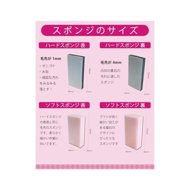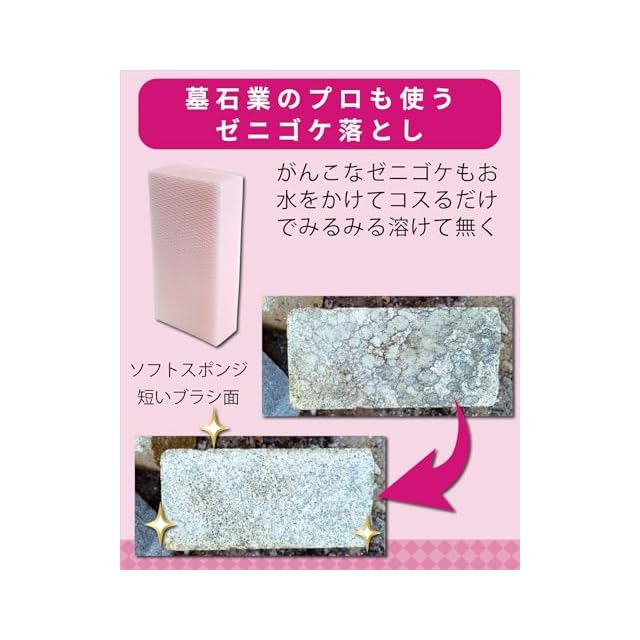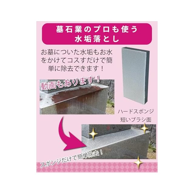 プロも使う墓石のガンコな汚れを落とすハードタイプとソフトタイプのスポンジ。お墓以外にもタイルや石畳などの玄関周りにも使えます。水とスポンジだけで水垢やゼニゴケを落とします。