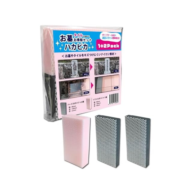 【プロも使う】ハカピカ お墓・タイル用 ハード・ソフトスポンジ 【4代目 墓石店監修】お墓 墓石 墓 タイル 石畳み 板石 掃除道具 石碑 墓掃除 墓石掃除 清掃 洗浄 汚れ 洗う お墓参り (1+2PACK) | つむぎ屋