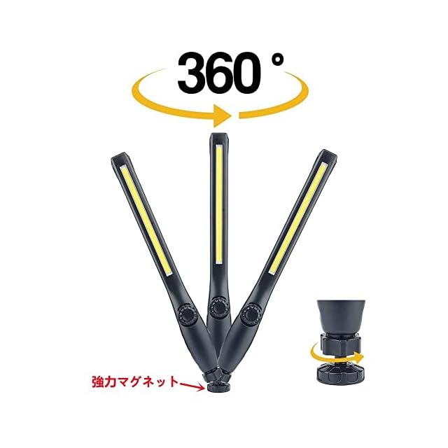 【回転式明るさ/角度を調節可能】 ライトの前は回転式スイッチが付いていますから、回転式スイッチを右に回して、スイッチをONになれてから、照明度はどんどん明るくになれます。底部はベースのナットを緩めて、作業灯のアングルを自由に調節することができます。場所によって、好きな角度を調節することができます。