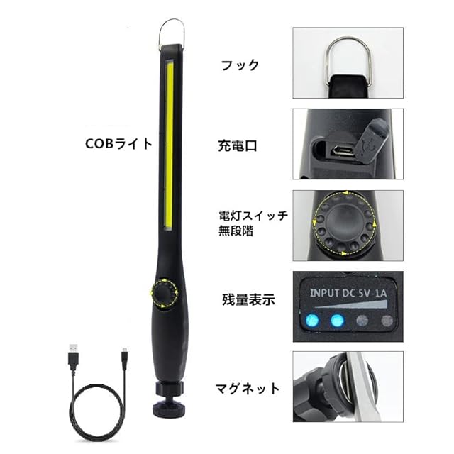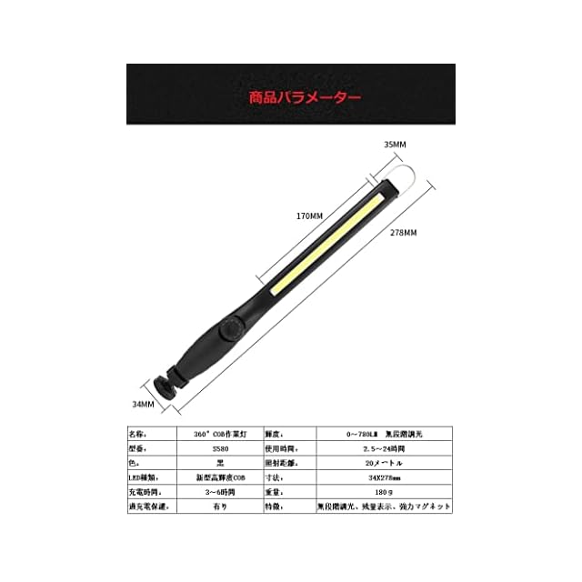 【高輝度】メインライトは新型「COB」LED採用しています。「COB」LEDとは大光量で単一面発光するLEDです。 均一なひとつの面で発光するため、光のバラツキを抑えます。普通の作業灯より、強い明るさになれます。360度で全方向均一に0-450LM(8W)の高輝度を提供します。