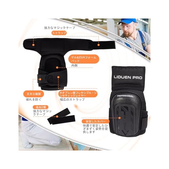 【2重ステッチと頑丈な素材】超強力な品質のステッチと過酷な使用に耐える素材が引き裂きや剥離を防ぎますから、如何なる硬質表面にも大活躍なヒザパッド。LIDUEN PRO作業用ひざあては膝の全面保護を確保できる重宝です。