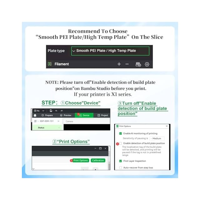 【優れた接着性のためのヒント】スライスで「滑らかなPEIプレート/高温」を選択してください。プリンターがX1/X1C/X1Eの場合は、プレートタイプを選択する前に「ビルドプレートの位置検出を有効にする」をオフにしてください。その後、造形ごとにビルドプレートを清掃してください