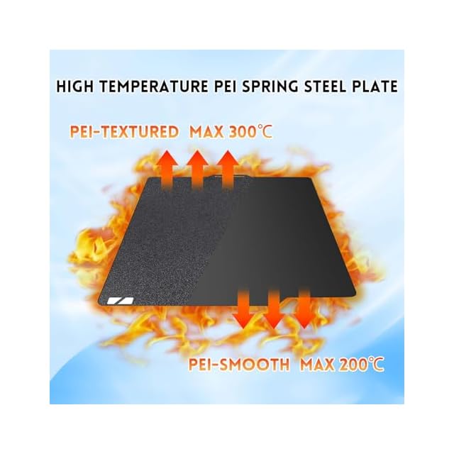 【互換性】両面PEIビルドプレートはPLA、PETG、ABS、TPU、ASA、PVA、ナイロンなどの高温フィラメントをサポートしています。テクスチャーPEI面の最高温度が300℃で、スムーズPEI板の最高温度が200℃である