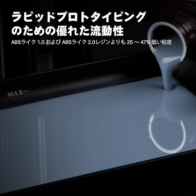 【流動性が良く、硬化が早い】ABS 類似樹脂 3.0 はABS-like 1.0やABS-like 2.0よりも25~47%低く、樹脂が素早く印刷領域に戻り、剥離フィルムから容易に剥離することができます。これにより、印刷の成功率が向上し、全体的な印刷時間が短縮されます。