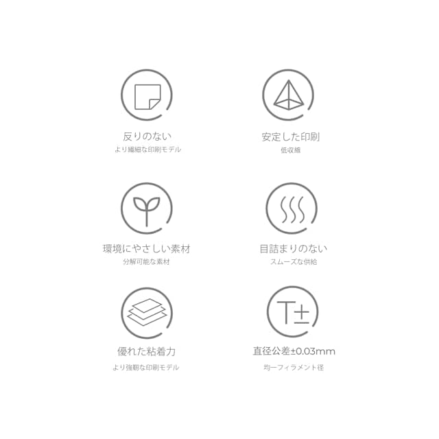 【高品質で環境に優しい素材】 PLAを主材料とし、成形が容易で、反りがなく、収縮率が低いというPLAの長所を引き継いでいます。