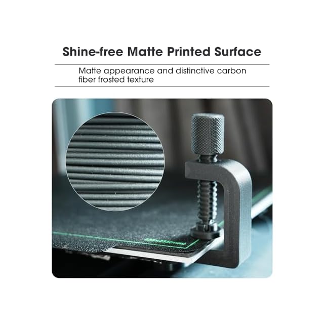 【光沢のない外観】:eSUN ePLA-CFフィラメントは、炭素繊維の添加により、PLAにマットな外観と独特のカーボンファイバーのフロストテクスチャーをもたらします。これにより、より目立たない積層でモデルを印刷することができます。構造的な目的や美学的な目的に関わらず、その優れた特性で簡単に使用できます。
