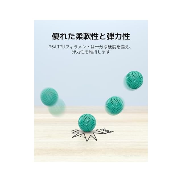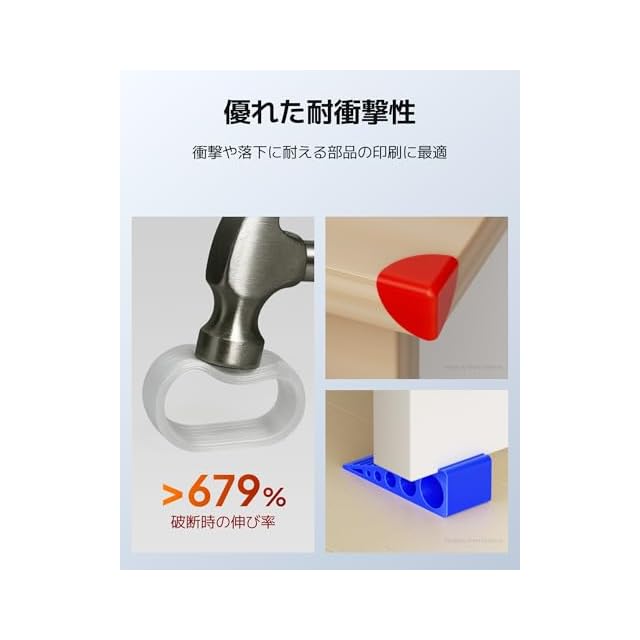 【優れた耐衝撃性】ELEGOG TPU 95Aは、優れた耐衝撃性を備えたソフトフィラメントで、繰り返しの衝撃、衝突、偶発的な落下にも耐える部品の作成に最適です。