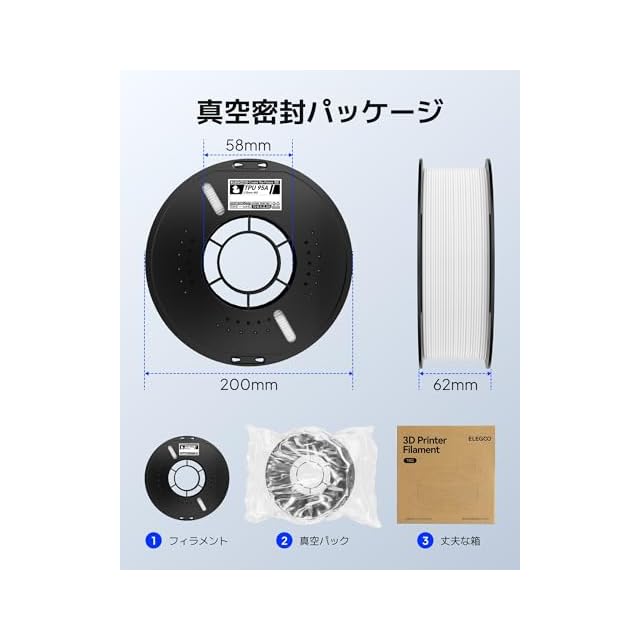 【目詰まりなし、気泡なし】包装前に完全に乾燥させ、真空シールで密封することで、湿気からフィラメントを保護し、目詰まりや気泡の発生を防ぎます。