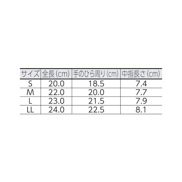 全長:20.0cm/手のひらまわり:18.5cm/中指長さ:7.4cm/サイズ:S