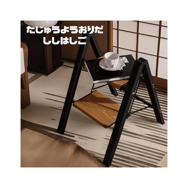 【おしゃれインテリアにもなる2段脚立】シックな黒木色ですのように清らかな「セレニティブルー」。リビングやキッチンに置いても違和感がなく、北欧風・ナチュラルインテリアにも自然に調和。単なる踏み台ではなく、お部屋を彩る折りたたみ式ステップです。