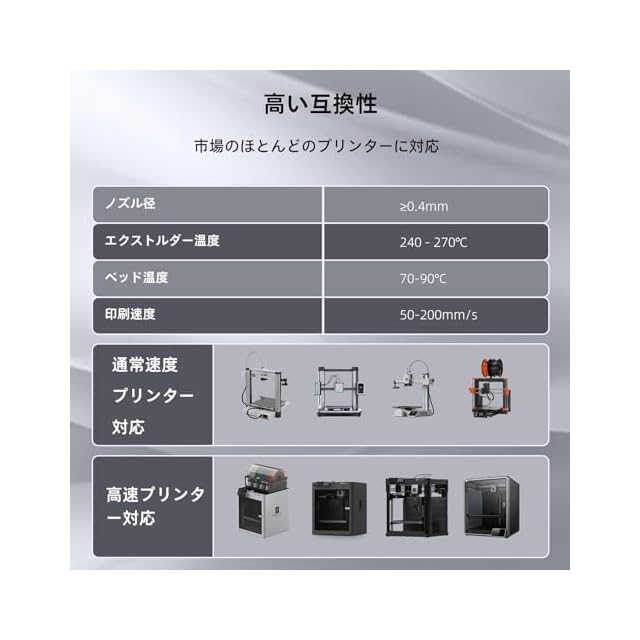 【幅広い互換性】製造精度の面で高品質の基準と±0.02mmの小さな寸法公差により、市場にある一般的な1.75mm FDM 3Dプリンターのほとんどと普遍的な互換性があります。例:Bambu Lab X1/P1P/A1/A1 mini、AnkerMake M5、Creality K1/K1 MAX、Flsun V400、Raise3D Pro3/RMF500 など。
