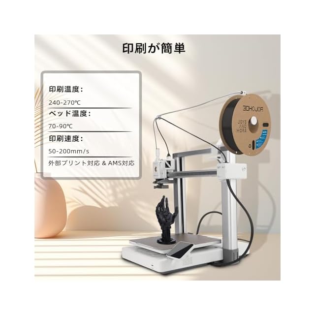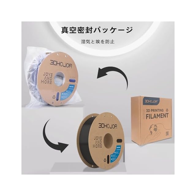 【BASIC PETG】:3DHoJor BASIC PETGフィラメント は、PLAとABSの長所を融合した高性能フィラメントです。 PLAの高い印刷性とABSの優れた機械的特性を兼ね備え、優れた靭性により割れや反りを防止。これにより、常に安定した高品質な3Dプリントを実現します。