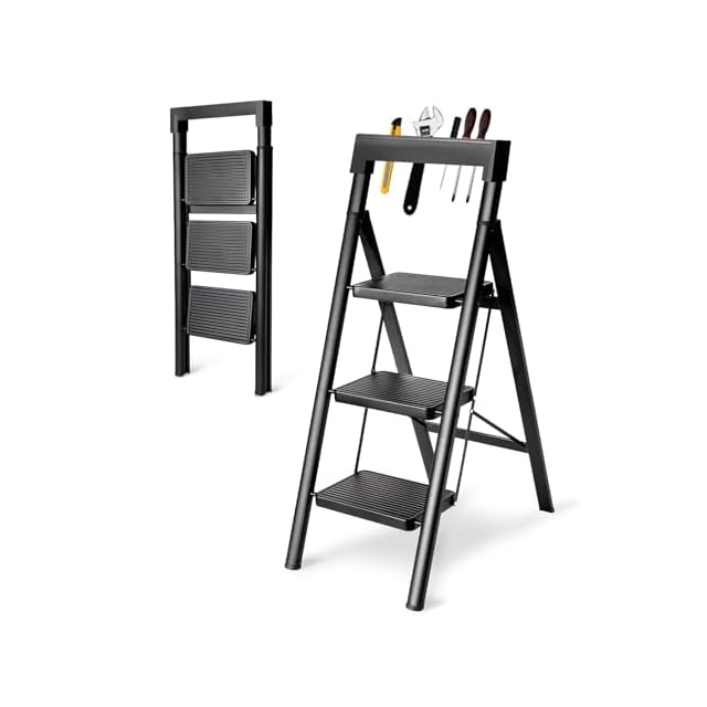 OSATA 脚立 折りたたみ式 手すり付き 室内・屋外用 耐荷重150KG コンパクト 省スペース 滑り止め付き (ブラック, 3段式)