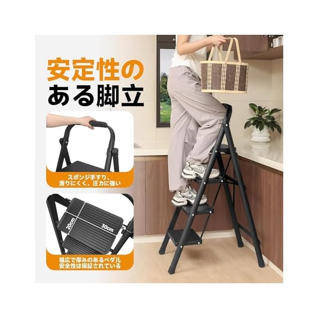 【より安全、より安定し】:安全性を重視し、手すりが付いています。ステップ部は幅と奥行きがあり(ステップのサイズは30×20cmで)、足が置きやすくなっています。高所作業でも安心してご使用いただけます。より安定して立ち上がることができます。す