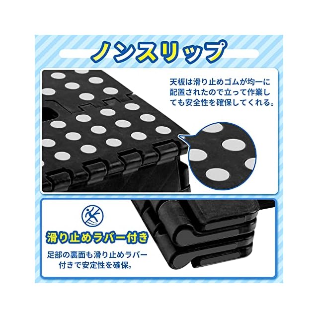【滑り止め付き】天板の上部は滑り止めゴムが均一に配置され、足部の裏面も滑り止めラバー付き。安定性確保できる折りたたみ踏み台。