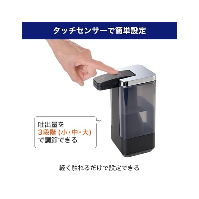 【透明タンクで中身が見える】泡タイプのハンドソープを入れるだけ。吐出量を3段階で調節できます。