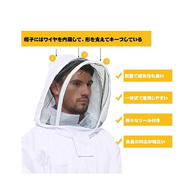 【こだわり】■フェイスネット:フェイス下のチャックがあり、服を着たまま顔が出せますし、途中での飲食も容易で便利です ■手首・足元をゴムでしっかりガードしており、虫や蜂の侵入を防ぎます。 ■顔面部分はメッシュ生地、ほかの部分は100%コットンのため通気性も良く夏場の作業も快適です。 ■ウエスト部分には便利なポケットがあり、さまざまなアイテムが収納できます。 ■脱着がしやすくて便利です。