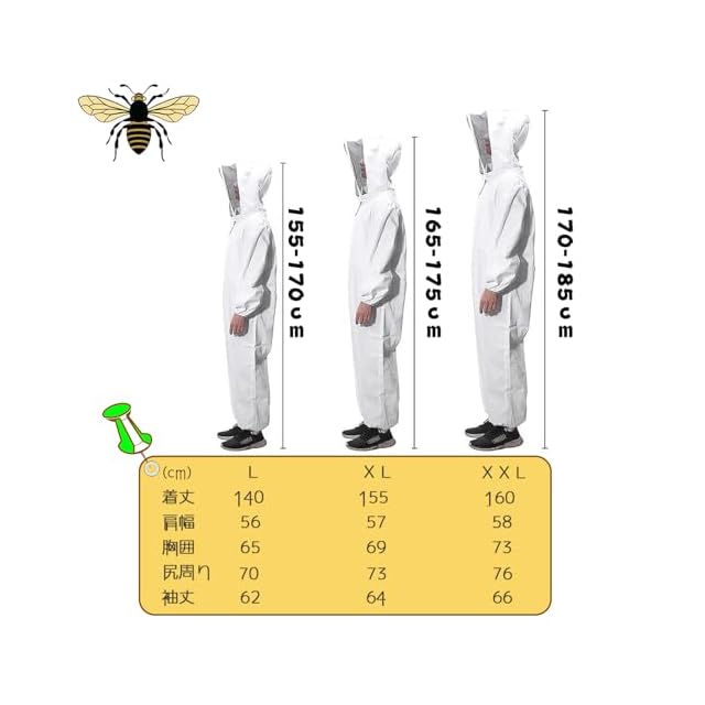 【セット内容】防護服一体式(フェイスネット付き) ■カラー 白(黒や紺などは攻撃を受けやしいので、白がオススメです) ■手袋 【サイズ】フリーサイズ 155cm~185cm ■ブラシ【サイズ】全長 40㎝【重量】1.4kg