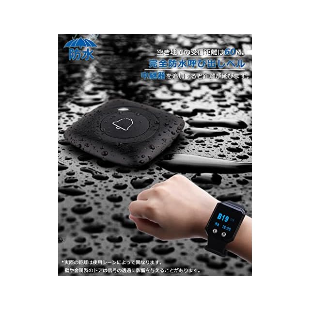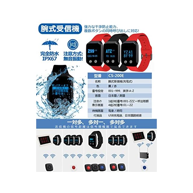 【多機能で完全防水】防水レベル:IPX67;注意方式:表示番号+振動;2種類の呼出表示:3桁の1番号+呼出種類、2桁の4番号;2つの言語の変換:日本語/英語;受信機データのコピー。