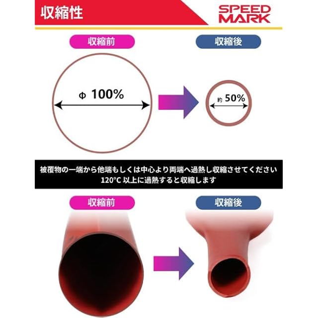【収縮率2:1で収縮が速い】熱収縮チューブは、ヒートガンやドライヤーで急速に収縮できます。収縮率は2:1。収縮温度は120度以上で、加熱後の予熱で縮んでいきます。