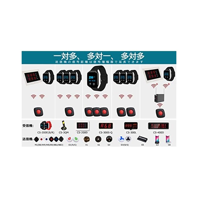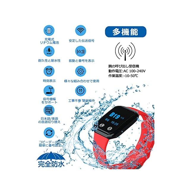 【多機能で完全防水】防水腕式受信機:IPX67。リマインダー方式:表示番号+振動。2種類の呼出表示切替:3桁の1番号+呼出種類、2桁の4番号。2つの言語の変換:日本語・英語。