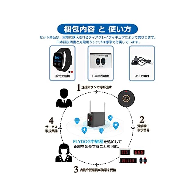 【大容量呼び出しチャイム】無線 高感度 腕式呼び出し受信機は001-ZZZから200個コールボタンの大容量。★【FLYDOG 受信機本体は単独では使用できません。 FLYDOG送信機と一緒に使用する必要があります。】★【梱包内容】: 腕式受信機*1、USB充電器*1、日本語説明書*1。