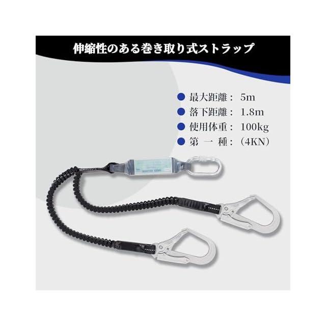 【新規格アップグレードシートベルト仕様】:合金鋼フック+高強度ポリエステル弾性ロープ、全身ベルト式シートベルト、高強度ポリエステルウェビング ロープの長さ:1.6M、幅45mm/厚さ1.8mm、ウエスト:78cm~ 136cm; 最大自由落下距離 1.8m、落下距離 3.3m、作業重量 100kg、牽引力 1600KG