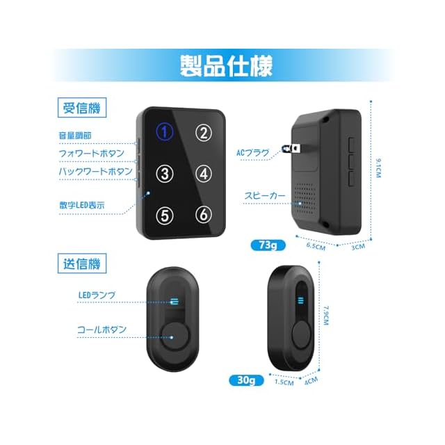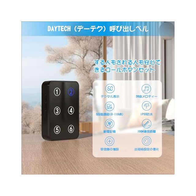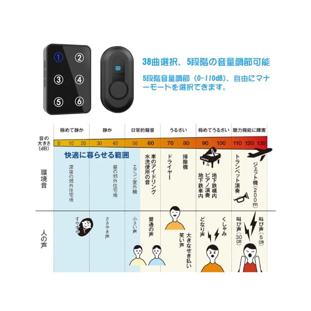【使用簡単&音楽選択】コールボタンを押すだけで受信機から音が鳴ります。38曲のメロデイーを選択でき、時間によって0~110dBまでの音量調節(5段階調節)が可能です