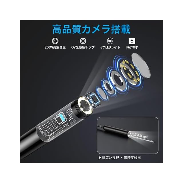 「200万画素&シングルレンズ」このファイバースコープは200万画素の高画質のカメラが搭載される故、パイブのトンネルやエンジン、機械装置、自動車など光線が暗いところに点検するときにも前の状況がはっきり観察できます。