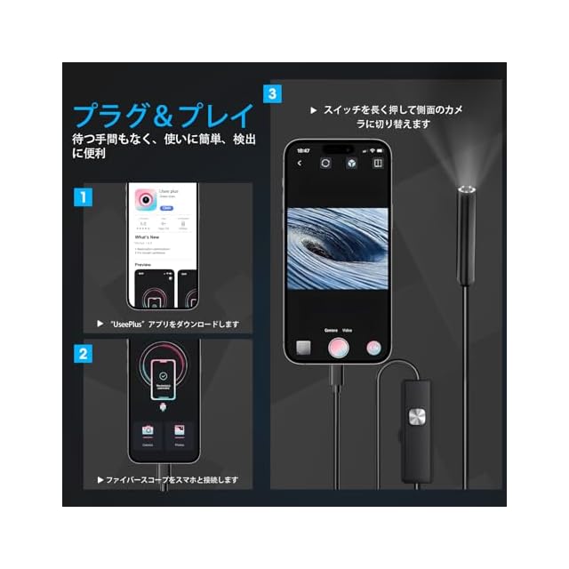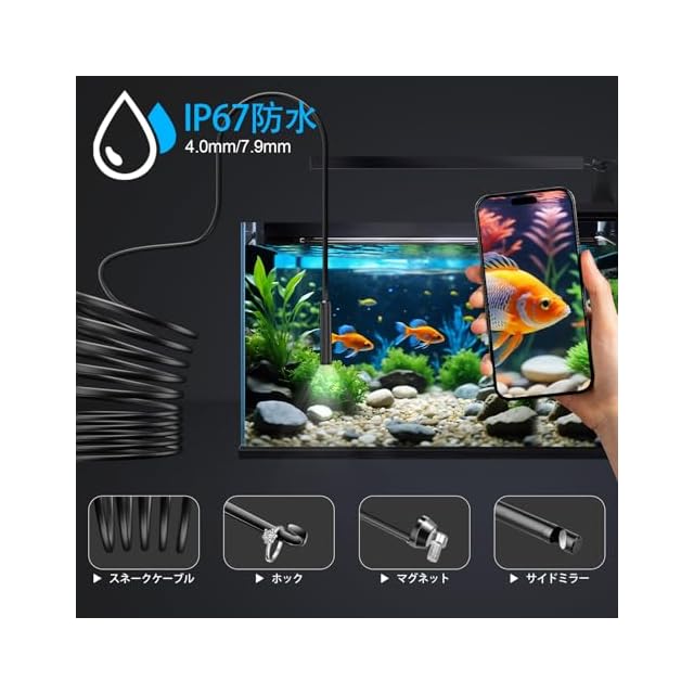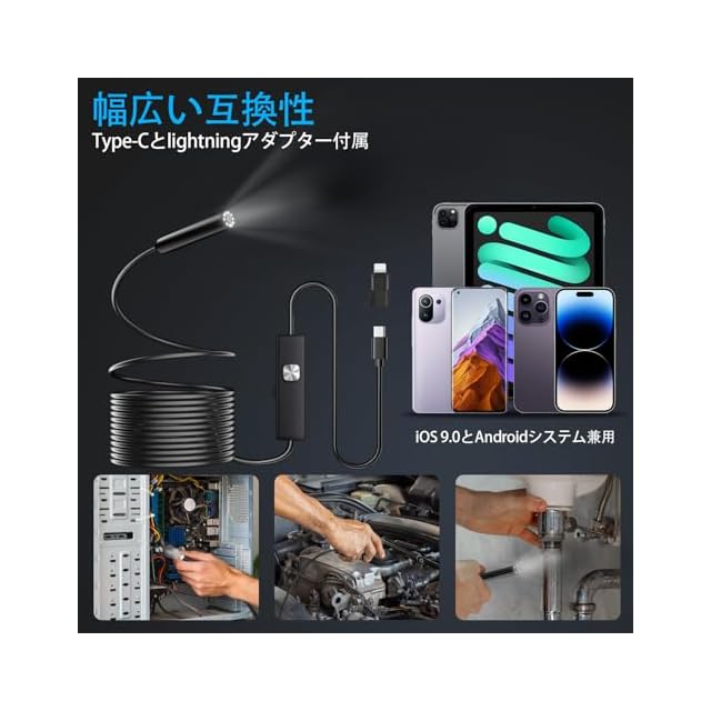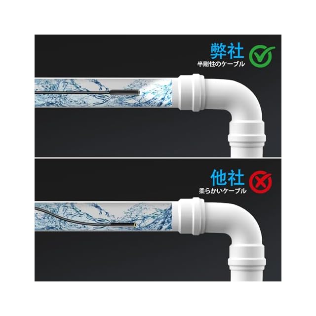 「IP67防水&5m半剛性ケーブル」IP67防水を備えるファイバースコープは水管に検査しても湿されなくてあなたの仕事にいい作業環境を提供します。自動車のエンジンの点検で油汚れがついても洗剤で洗い可能。半剛性ケーブルで曲げたり、伸びたりしてシーンで柔軟に対応でき、5mという長さで細長い水管での検査は十分です。