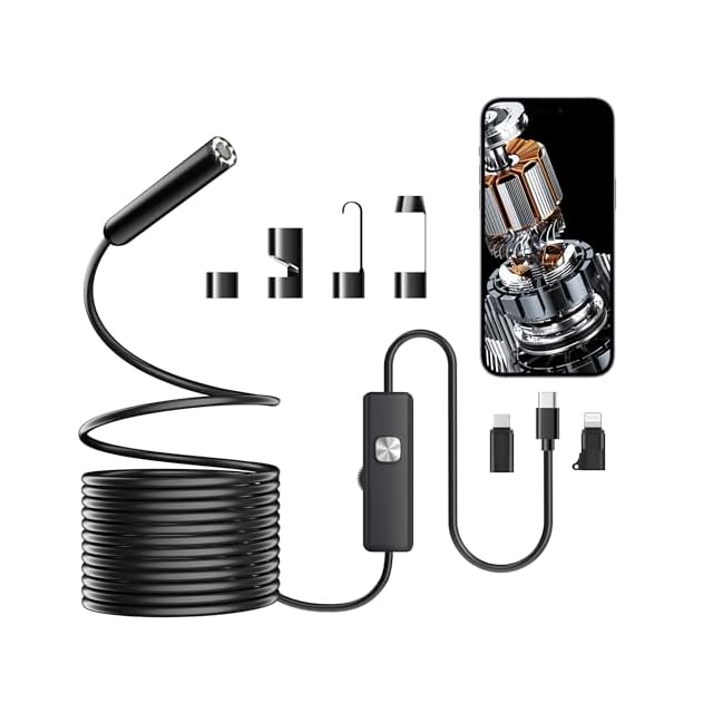 【200万画素&シングルレンズ】ファイバースコープ LEEKEY 防水内視鏡カメラ 7.9mmスコープ 8個高輝度LEDライトマイクロスコープ IP67防水 5m半剛性ケーブル USB Typc-C lightning接続 Android iPhone 対応 家庭用 機械点検 自由研究 24ケ月付