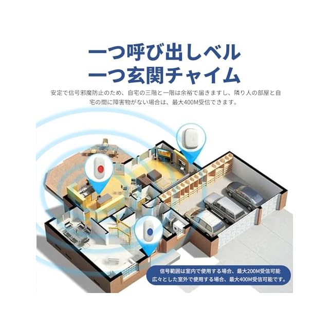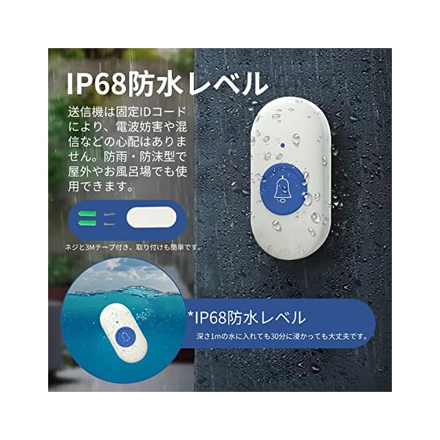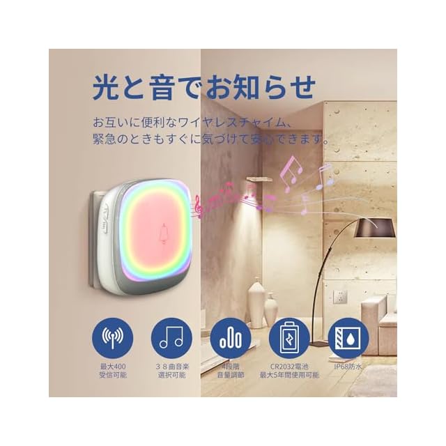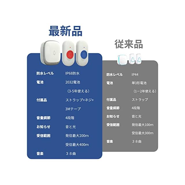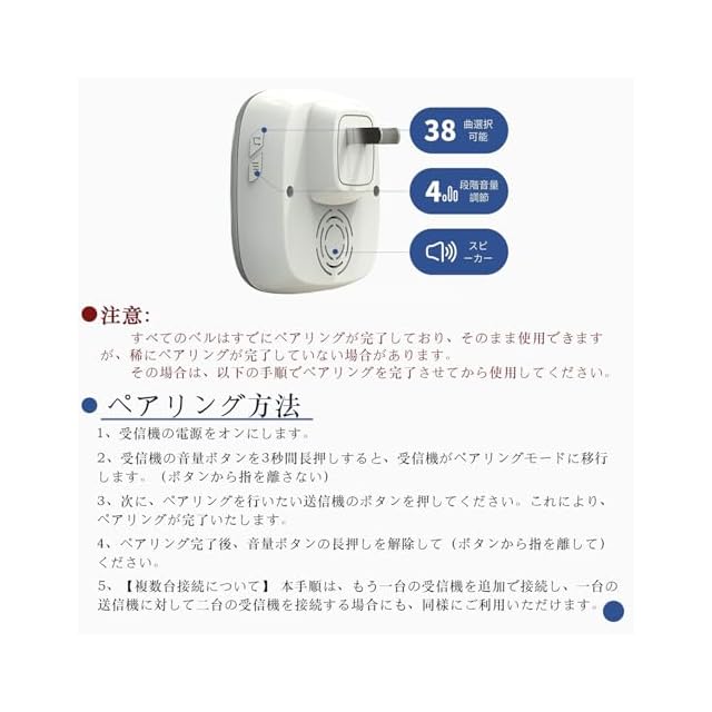 【使用簡単】ボタンを押すだけで受信機から音が鳴ります。38曲のメロデイーを選択できて、必要に応じて、音量が25db~110dbまで4段階で調節可能です。お子供と年寄りの方も使用できます。 いろんな環境と要求を満足できます。