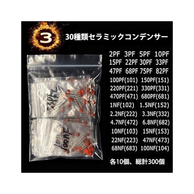 【セラミックコンデンサー】2P 3P 5P 10P 15P 22P 30P 33P 47P 68P 75P 82P 101(100P) 151(150P) 221(220P) 331(330P) 471(470P) 681(680P) 102(1NF) 152(1.5NF) 222(2.2NF) 332(3.3NF) 472(4.7NF) 682(6.8NF) 103(10NF) 153(15NF) 223(22NF) 473(47NF) 683(68NF) 104(100NF)(全30種類、各10個、総計300個)