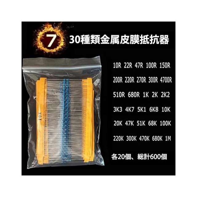 【金属皮膜抵抗器】カーボン皮膜抵抗器よりも、抵抗値の精度が高く、安定しており、取り扱いが容易です。さらに、抵抗器のカラーコードが付属しています。10Ω、22Ω、47Ω、100Ω、150Ω、200Ω、220Ω、270Ω、330Ω、470Ω、510Ω、680Ω、1KΩ、2KΩ、2.2KΩ、3.3KΩ、4.7KΩ、5.1KΩ、6.8KΩ、10KΩ、20KΩ、47KΩ、51KΩ、68KΩ、100KΩ、220KΩ、300KΩ、470KΩ、680KΩ、1M(全30種類、各20個、総計600個)