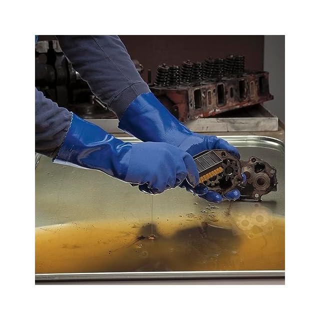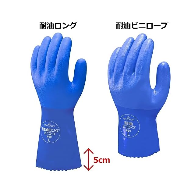 【油に強く、丈夫】特殊配合の塩化ビニル樹脂を全面にコーティングしたオールコート手袋(裏布付き)で耐油性に優れた「耐油ビニローブ」より【+5cm長いロングタイプ】です。