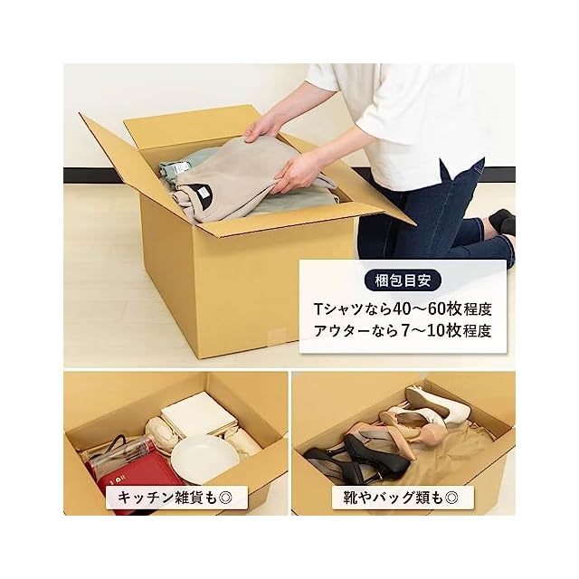 Tシャツなら約40~60枚、アウターなら7~10枚程度を梱包できます。折りたたみ配送で省スペース保管できます。
