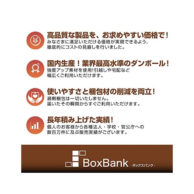 【 ボックスバンクⓇ 】ブランドの高品質ダンボール。国内上場企業の最高水準の工場で製造。強度をしっかり保ちながら軽量化を実現し、強化中芯120gを採用した丈夫な仕様。引越し・宅配・保管など幅広い用途でご利用いただけます。