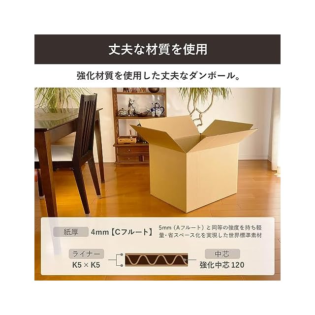 材質:Cフルート 4mm K6×K6(強化中芯120 - 坪量120±3.0g/㎡、リング圧縮強さ: 192N以上、ISO圧縮強さ: 1.26kN/m以上、CO2排出量: 146g-co2/㎡)