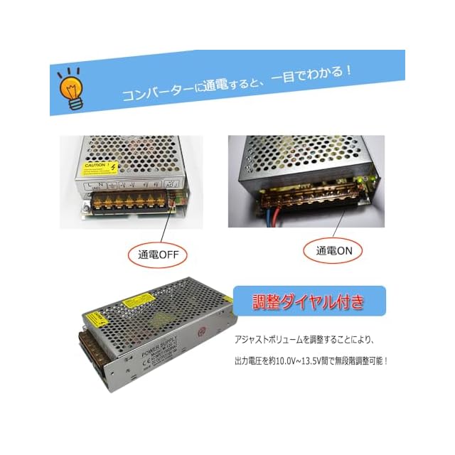 出力電圧を約10.0V~13.5Vの間で、無段階調整可能な「調整ダイヤル」も付いています。※12V・24Vの商品ともに、上15%下15%の範囲で調整が可能です。
