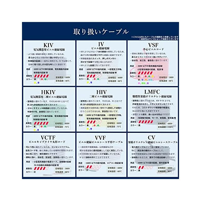 導体に可とうより線 電線:KIV サイズ:8SQ 定格電圧:600V 定格温度:60℃ 芯線面積:8m㎡ 導体外形:3.7mm 被覆厚:1.2mm 電線外形:6.1mm 許容電流:61A 耐電圧:2000V/1min.