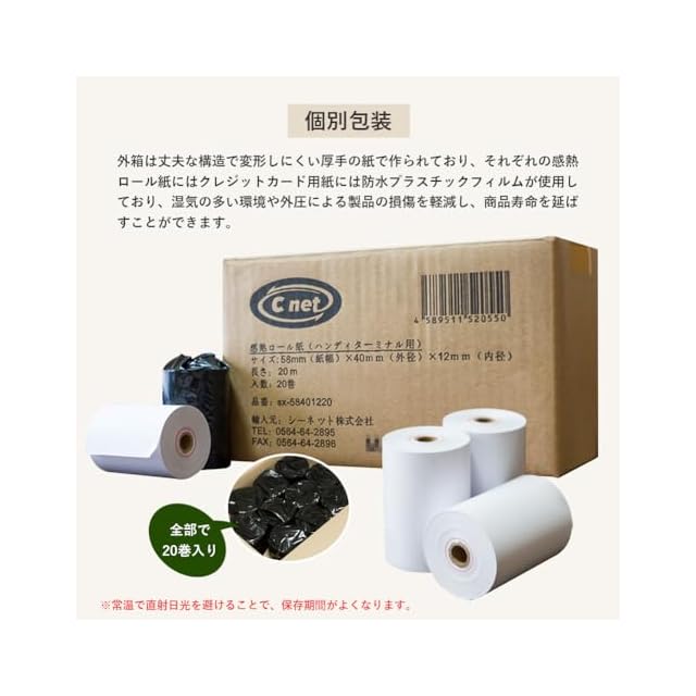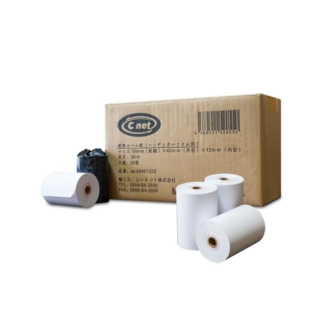 【商品仕様】感熱ロール紙サイズ:幅58mm×外径40mm×内径12mm 20巻入、紙の厚さ:65μです。