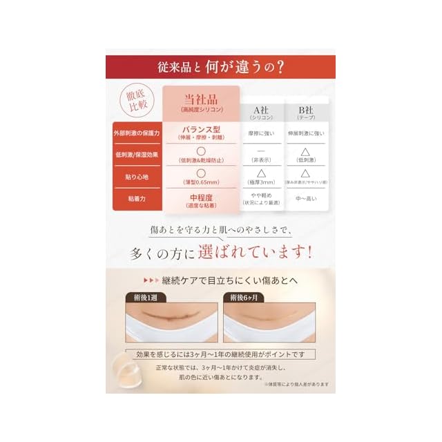 ✅【傷あとを広げず守り、肌もツッパりにくい】やわらかいシリコン素材が傷あとにしっかりフィットし、傷あとが広がらないように安静を保ちます。痒みの原因にもなる“肌のつっぱり感が少ない”やわらかシリコンです。