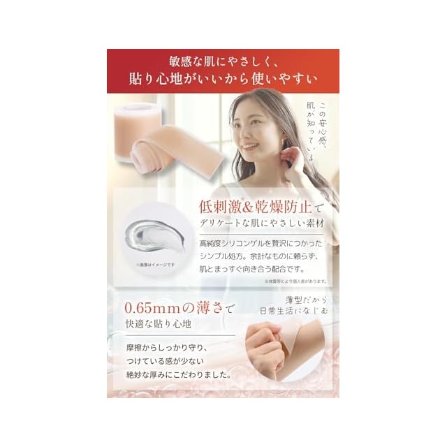 ✅【肌にやさしい使い心地】100%ピュアなシリコンゲルのテープ素材で、余計な成分はゼロ。低刺激設計で、敏感肌やアレルギー体質の方でも安心して使用可能。乾燥を防ぎながら、肌をやさしく守ります。