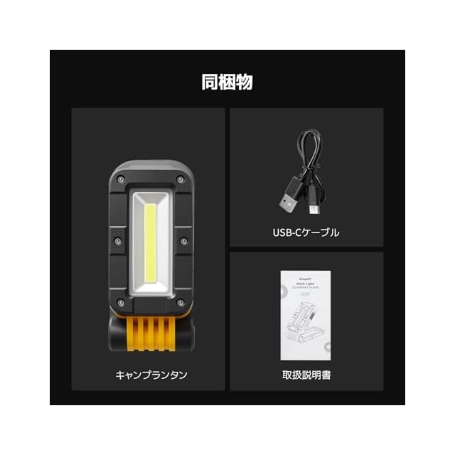 必要なアクセサリーがすべて揃った同梱物:作業灯本体、USB-Cケーブル、日本語取扱説明書付きで、購入後すぐに使用可能。初心者でも安心のセット内容です。