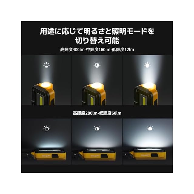 1.明るさと照明モードを自由に切り替え可能: 用途に応じて高輝度400lmから低輝度12lmまで調整可能。作業環境やニーズに合わせた最適な明るさを実現します。